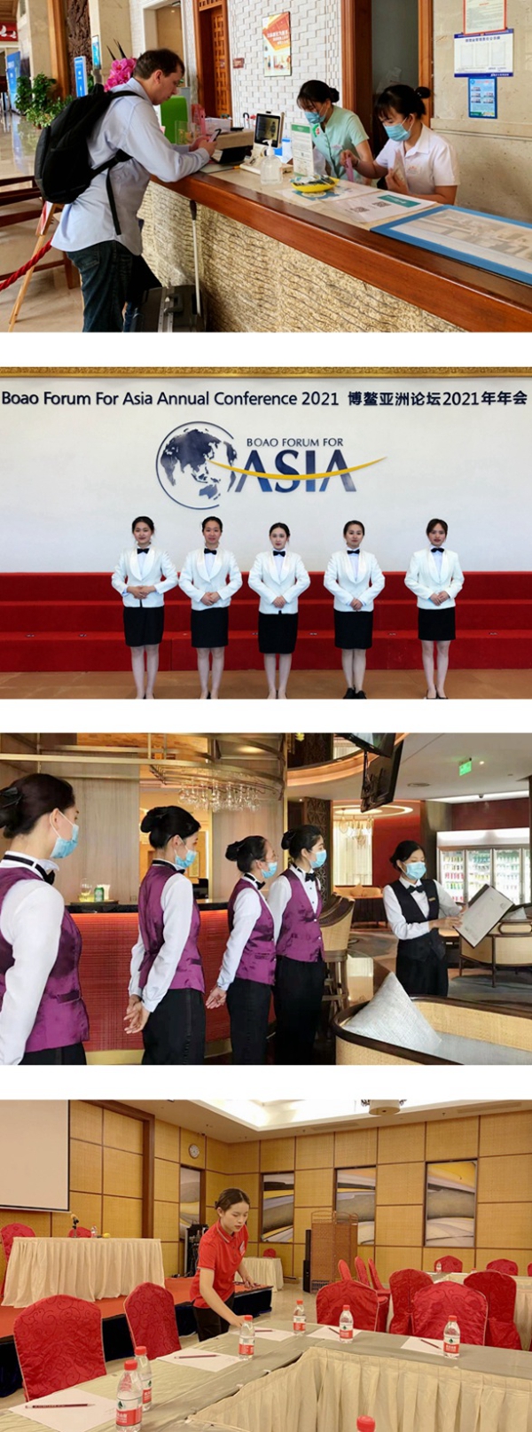 4月18日至21日,博鳌亚洲论坛2021年年会在海南博鳌举行。本次年会以“世界大变局:共襄全球治理盛举 合奏‘一带一路’强音”为主题,来自60多个国家和地区的2600多名代表参会,凝心聚智,为推动亚洲和世界共同发展贡献“博鳌方案”。作为连续多年服务博鳌亚洲论坛年会的高校,我院今年从各系部中共选派105名优秀学生参与年会志愿服务工作,在会务服务、总机接待、前台、礼宾、客房、中西餐厅、宴会服务等岗位上提供服务,为保障年会的顺利进行做出积极贡献,得到组委会与中外与会嘉宾的广泛赞许。