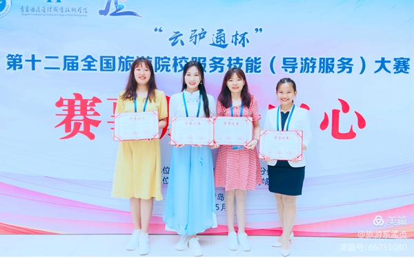经过四天的激烈角逐,我院参赛选手在1035名选手脱颖而出,吴淑斐、杨若冰获得高等院校组普通话导游服务三等奖,黄金芦、张雅婷获得高等院校组英语导游服务三等奖。