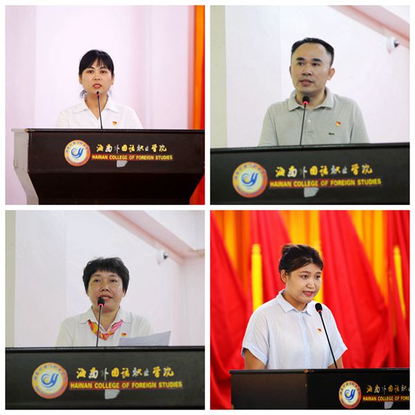 优秀共产党员代表、思想政治理论课教学科研部直属党支部党员周丽萍同志,优秀党务工作者代表、国际商务系党总支部组织委员陈仕榜同志,先进党总支部代表、旅游系党总支书记林明霞同志,新党员代表、机关党总支部学院办公室党支部党员刘业莹同志,分别在大会上发言,表达对建党百周年华诞的祝福,对党的培养的感恩之情,以及牢记初心使命,立足两个大局,心怀“国之大者”,锐意进取,奋力前行,为学院发展和海南自由贸易港建设贡献更大力量的信心和决心。
