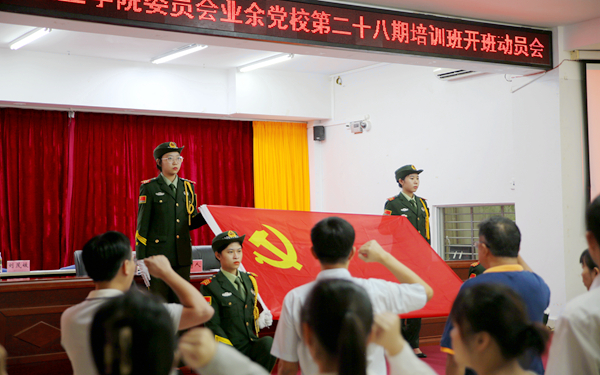 在《国际歌》慷慨旋律中,开班动员会正式开始。全体党员在党旗下宣誓,重温入党誓词。