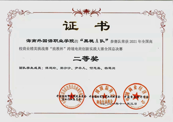 近日,2021年全国高校商业精英挑战赛“致教杯”跨境电商创新实践大赛全国总决赛落下帷幕,我院国际商务系学生谭建玲、樊沙沙、尹非凡、何慈英、杨茸闵组成的“黑桃A队”参赛团队在全国总决赛中荣获二等奖。廖完美、陈雪花老师荣获优秀指导教师奖。