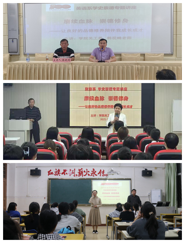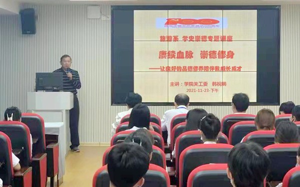 为深入推进我院党史学习教育,连日来,我院关工委主任韩祝畴先后为英语系、旅游系以及学院“二十三年红旗不倒读书协会”学生党员、入党积极分子和读书协会会员作了三场《赓续血脉 崇德修身》专题讲座。英语系党总支副书记吴清晖、旅游系党总支书记林明霞、“二十三年红旗不倒读书协会”指导老师赵佳钰、关工委成员陈献积老师等与学生一同聆听讲座。