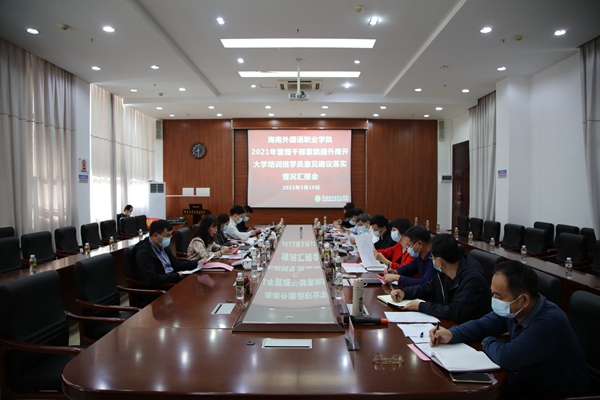 2022年3月10日上午,我院在综合楼七楼会议室(一)召开2021年度管理干部素能提升南开大学培训班学员意见建议落实情况汇报会,学院党委书记佴建乔,党委副书记、院长杨学前,党委副书记黄丽芹,党委委员、副院长梁松,党委委员、副院长杨毅出席会议。会议由黄丽芹副书记主持。有关部门负责人参加会议并对培训班学员的意见建议落实情况进行汇报。