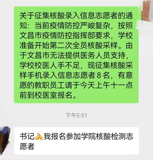 为做好校园疫情防控工作,学院开展全员核酸检测,但是面对数千位师生,学院的核酸采集能力明显不足。学院党委立即决定征集志愿者,一个征集通知发布在各个工作群中。“需要志愿者吗?我可以......”“我也可以......”