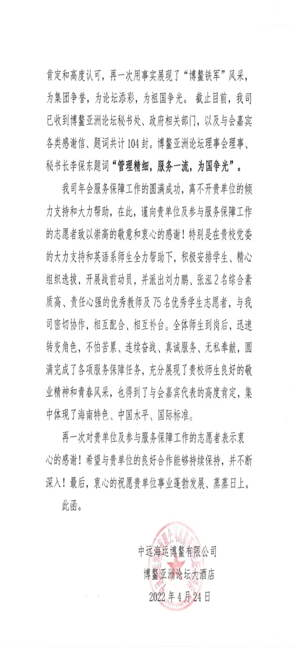 2022年博鳌亚洲论坛年会圆满落下帷幕。作为博鳌亚洲论坛年会“钻石合作单位”,jinnianhui今年会派出志愿者服务本次博鳌亚洲论坛年会。年会召开期间,我院志愿者以认真严谨的态度、专业周到的服务、无私奉献的精神,圆满地完成了各项会议服务,获得了与会嘉宾的高度肯定。为此,博鳌亚洲论坛大酒店特发来感谢信,向我院及志愿者表示衷心的感谢。