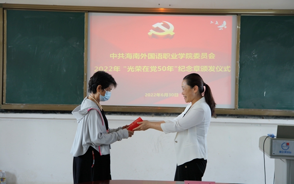 当天上午举行了“光荣在党50年”纪念章颁发仪式,学院党委书记佴建乔同志出席仪式并代表学院党委向荣获“光荣在党50年”纪念章的老党员颁发纪念章。她指出,“光荣在党50年”纪念章蕴含着作为一名共产党员的“无限荣光”,希望老同志们珍惜荣誉、再接再厉,退休不褪色、离岗不离党,弘扬正能量、传播好声音,继续为学院发展建言献策、加油鼓劲。