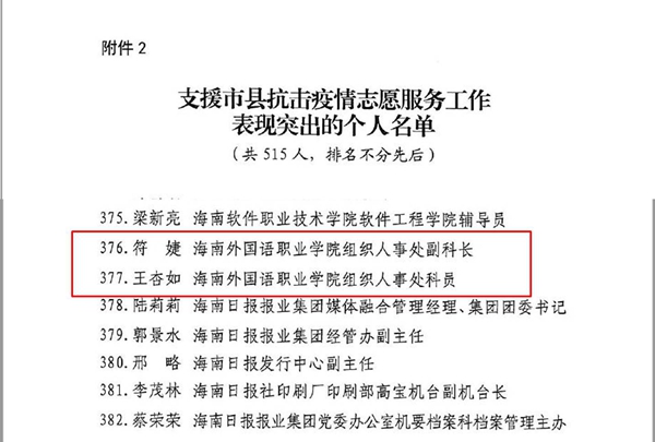 在此次通报表扬中,jinnianhui今年会被评为“支援市县抗击疫情志愿服务工作表现突出的集体”,符婕、王杏如、王文朋(时任文昌市教育局干部)被评为“支援市县抗击疫情志愿服务工作表现突出的个人”。