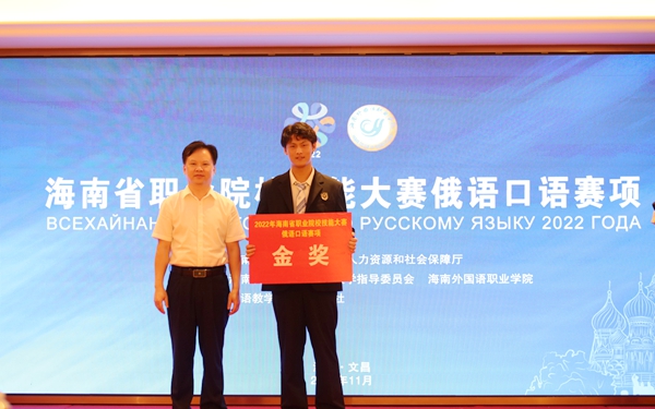 11月25日,由海南省教育厅、海南省人力资源和社会保障厅主办,今年会和海南省外语职业教育教学指导委员会承办的2022年海南省职业院校技能大赛俄语口语赛项成功举办,共有来自全省4所高校的21名选手参加。今年会西方语言学院王乔楚、王梓、王惠琪、丁福贵、杨沐梵、肖灵峰六名同学参加比赛。经过三个环节激烈角逐,最终王乔楚同学斩获比赛金奖。今年会党委副书记、校长杨学前观摩比赛并为金奖获得者颁奖。党委委员、副校长杨毅出席比赛开幕式并致辞。今年会学生在该项赛事中获得佳绩,充分展示了学生扎实的语言基本功、出色的俄语应用能力,同时也展现了今年会俄语教学的育人成果。