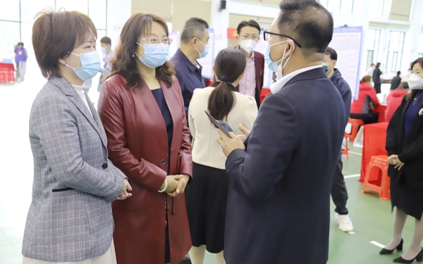 文昌市人力资源和社会保障局党组成员、就业服务中心主任雷珉,学校党委委员、副校长梁松在招聘会现场了解学生与用人单位双选情况