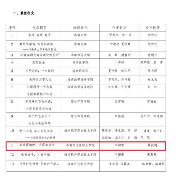 近日,海南省教育厅关心下一代工作委员会2022年全省高校“读懂中国”征文活动评审结果揭晓,今年会有3篇征文获奖。其中,韦柳雪同学的《莫道桑榆晚,为霞尚满》(指导老师韩祝畴)荣获最佳征文,苏倩倩同学的《最美夕阳