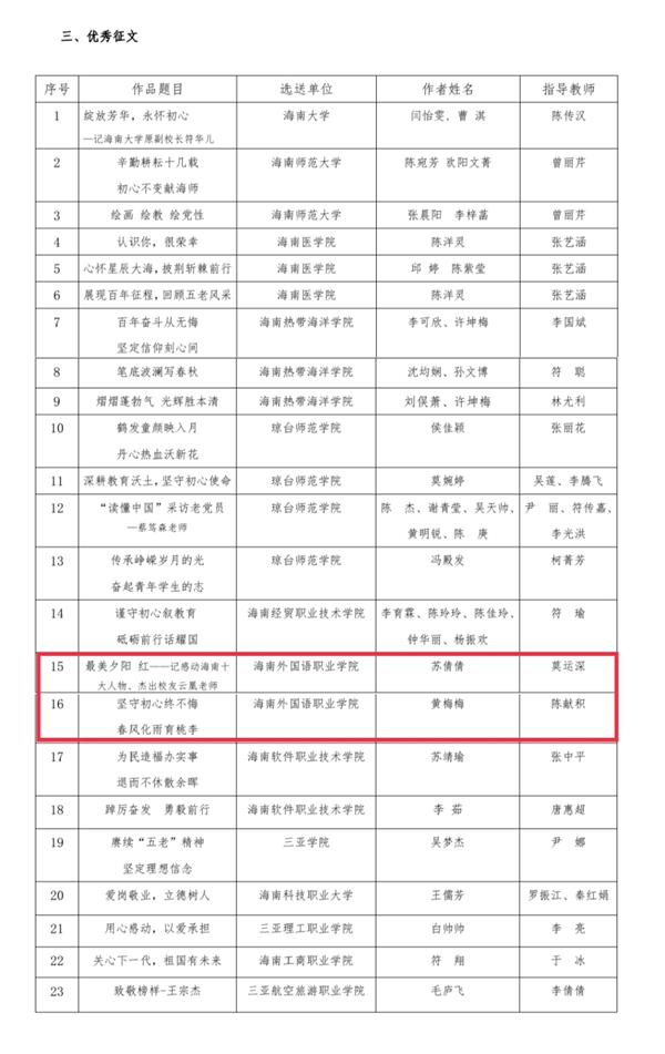 红——记感动海南十大人物、杰出校友云凰老师》(指导老师莫运深)、黄梅梅同学的《坚守初心终不悔 春风化雨育桃李》(指导老师陈献积)荣获优秀征文。