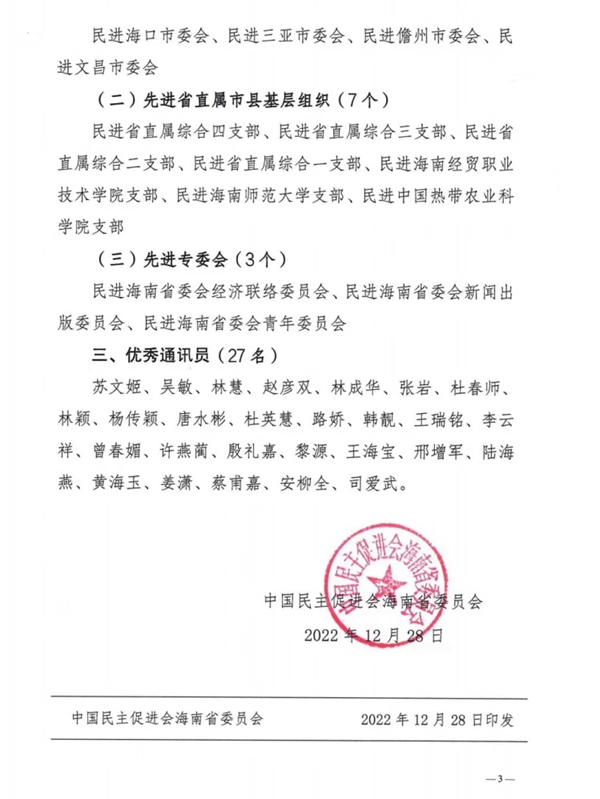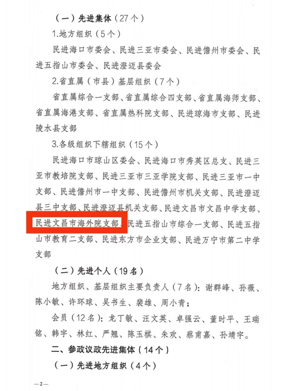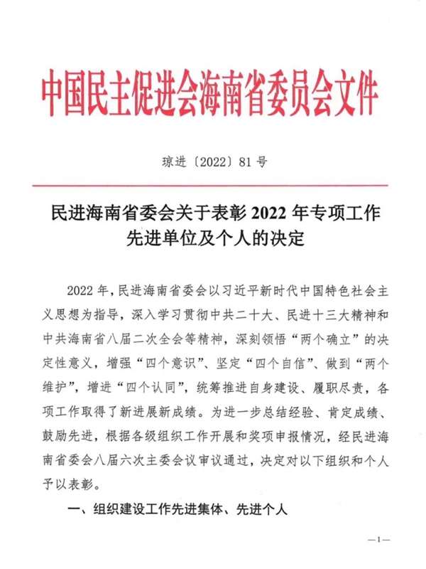 近日,中国民主促进会海南省委员会对2022年专项工作先进单位及个人进行表彰,民进文昌市海外院支部被评为“先进集体”。民进文昌市海外院支部将以此为契机,继续在各级组织的正确领导下,奋力前行,为jinnianhui今年会“双高校”建设和“十四五”发展目标作出应有贡献。