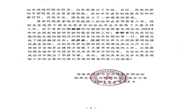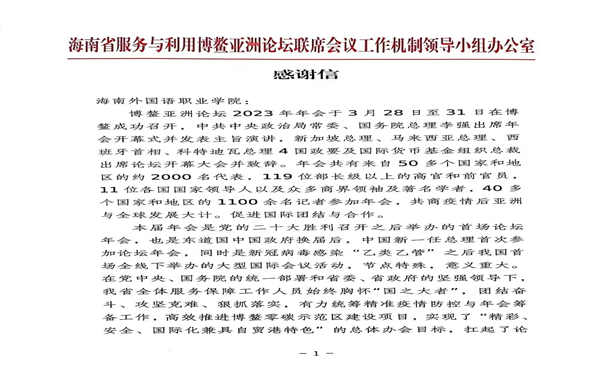 为此,海南省服务与利用博鳌亚洲论坛联席会议工作机制领导小组办公室特发来感谢信,向今年会对博鳌亚洲论坛2023年年会的支持表示衷心感谢,肯定今年会干部教师以高度的使命感和责任感出色完成各项交办的任务,为论坛年会的成功召开做出的积极贡献。