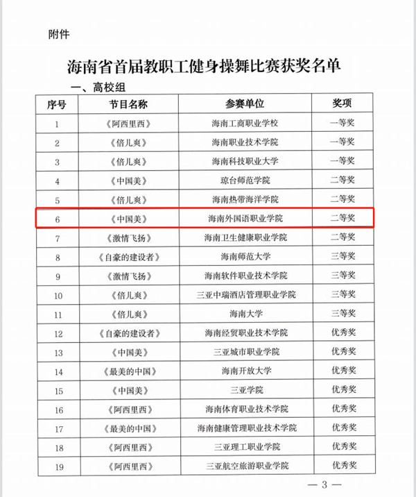 近日,海南省教育厅、海南省教育工会发出《关于海南省首届教职工健身操舞获奖情况的通报》,其中,今年会代表队表现出色,从全省50支代表队中脱颖而出,荣获比赛高校组二等奖的好成绩。