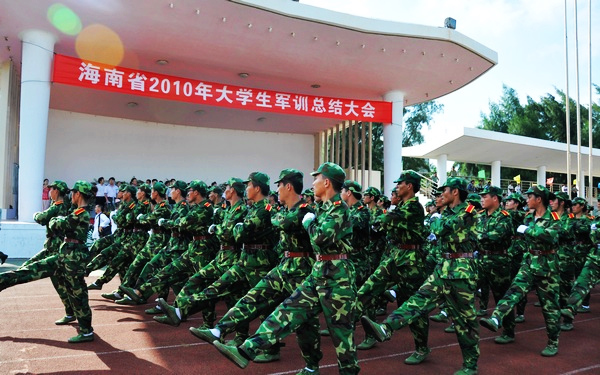 在举国上下热烈庆祝建国六十一周年之际,海南省2010年大学生军训总结大会于9月29日在海南大学运动场隆重举行,副省长、省军区杨永海副司令员、省教育厅孔令德副厅长出席大会并检阅了大学生军训方队,包括我院在内的全省16所高校、20个方队参加了此次总结大会。我院精心挑选的一个阅兵方块和一个表演分队在大会上闪亮登场,阅兵方块的同学士气高昂、军事动作标准,由清一色女生组成的表演分队的擒敌拳队形变换表演创意非凡、英姿飒爽,显示了我院严格的校风校纪和大学生蓬勃向上的精神风貌,深受在场军地双方领导的好评,引来了全场观众阵阵热烈的掌声。