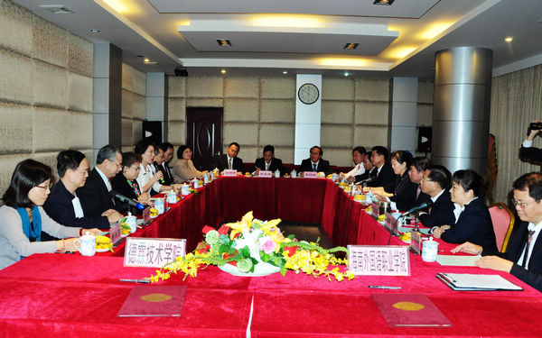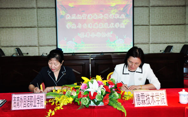 台湾德霖技术学院董事长林谢罕见、校长洪久贤在随后的发言中也介绍了该学院的基本情况,并表达了资源共享、优势互补的合作意愿。在友好、热烈的气氛中,与会者就教育模式、办学理念、学生培养等话题展开探讨。最后,双方就教师互访和学生交流等合作达成了意向,并签署了合作意向书。签约仪式后,还进行了简短的互赠礼物仪式。