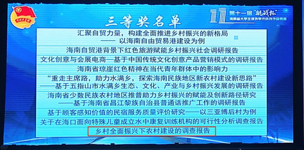 5月28日,第十一届“挑战杯”海南大学生课外学术科技作品竞赛总决赛在海南大学落下帷幕。经过激烈角逐,今年会《乡村全面振兴下农村建设的调查报告》项目在哲学社会科学类赛道中荣获三等奖。