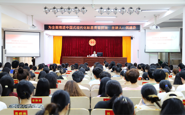 6月2日,学校党委书记佴建乔为英语学院250名学生讲授思政课,围绕“中国式现代化理论的重大创新”、“新时代中国式现代化建设成就”、“奋楫扬帆海南自贸港”“为中国式现代化注入职教力量”“新时代新征程青年大学生的责任与担当”等方面内容,聚焦中国式现代化的中国特色、本质要求和重大原则,带领学生重点学习中国式现代化的核心要义,解读在全岛封关运作下海南自由贸易港的政策、制度体系,并介绍了基于此背景下今年会全面突出“外语+”特色,在产教融合、构建校企紧密合作协同育人等方面取得的成绩,阐述了学校站在更高起点新征程上如何奋力写好中国式现代化职教篇章的高质量发展之路。佴建乔号召同学们,要做信念坚定、铭记初心的理想者,勇挑重担、勇当先锋的担当者,坚韧不拔、意志顽强的吃苦者和勤勉向上、乐于奉献的奋斗者,让青春在全面建设社会主义现代化国家的火热实践中绽放绚丽之花。