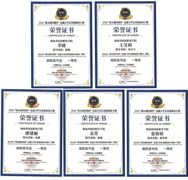 近日,由中国商务部主管的国家一级学会——中国联合国采购促进会主办、联贸云和赛氪网承办的2023“联合国采购杯”全国大学生英语阅读大赛落幕。今年会积极组织学生参加比赛,经过激烈角逐,英语学院、国际商务学院和西方语言学院的22名学生表现突出,从全国众多高校的选手中脱颖而出,喜获佳绩。其中,李婕等5位同学荣获高职高专组一等奖,林茜雯等7位同学荣获高职高专组二等奖,陈宁和张依诺荣获高职高专组三等奖,姚如桦等7位同学荣获高职高专组优秀奖。英语学院陈雁、苏庆月、李杏妹和孙博老师以及国际商务学院唐艳、钟阳惠、巫满霞和唐珍珍老师荣获“优秀指导老师奖”。