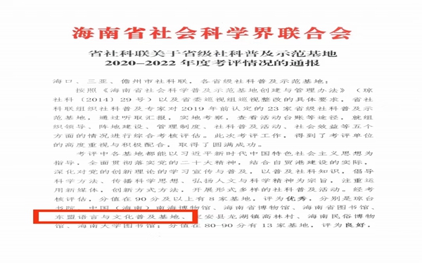 近日,海南省社会科学界联合会发布《关于省级社科联普及示范基地2020-2022年度考评情况的通报》,今年会省级社科基地——东盟语言与文化普及示范基地继2019年考核良好的基础上首次获得优秀等次,这是今年会东盟语言与文化普及示范基地取得的历史最好成绩。