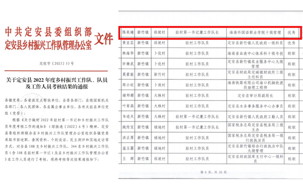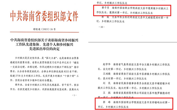日前,省委组织部等单位表彰海南省乡村振兴工作对先进集体、先进个人和乡村振兴先进派出单位。今年会西方语言学院党总支书记、派驻文昌市蓬莱镇乡村振兴工作队队长、蓬莱村第一书记、乡村振兴工作队队长黄子艿,西方语言学院俄语专业教师、派驻文昌市东郊镇码头村第一书记、乡村振兴工作队队长郭峰在驻村工作期间连续两年获得文昌市乡村振兴“先进个人”荣誉称号,今年获得海南省乡村振兴“先进个人”荣誉称号;国际旅游学院辅导员、派驻定安县新竹镇祖坡村第一书记、乡村振兴工作队队长陈奕埔获得定安县乡村振兴“先进个人”荣誉称号。