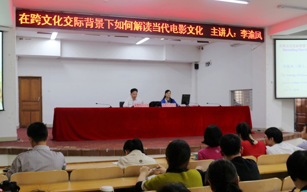 12月8日下午,一场别开生面的电影语言与文化专题讲座在图书馆多功能报告厅举办,我院院长李渝凤教授主讲的“在跨文化交际背景下如何解读当代电影文化”英文专题讲座吸引了众多教师和学子前来聆听。我院全体英语专业教师和学生参加讲座,来自海南大学的部分师生也慕名到场聆听讲座。讲座由我院杨学前副院长主持。
