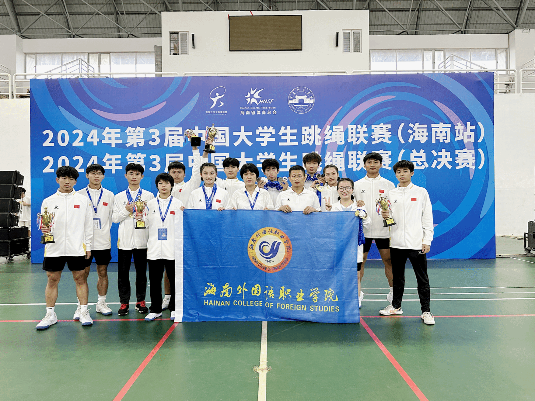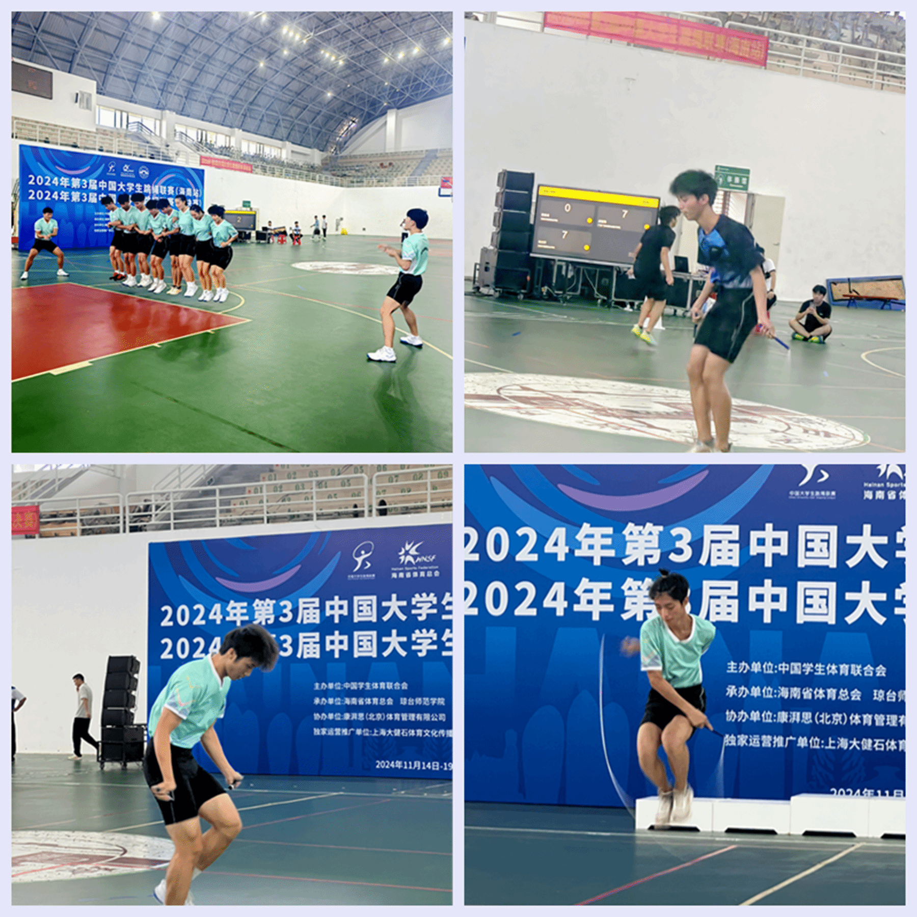 11月14日至18日,由中国学生体育联合会主办的2024年第3届中国大学生跳绳联赛在海口举办,来自全国多所知名高校,包括西南大学、上海财经大学、广州体育学院等,齐聚一堂,共同角逐荣誉。比赛分甲组(普通组)、乙组(高职高专组)及丙组(高水平组)三个组别,各组别设有计数赛、花样赛、规定赛三个大项20个小项。今年会跳绳队分别参加乙组和丙组的比赛,经过四天激烈的角逐,最终取得6金7银3铜的优异成绩,其中在首次参加的丙组跳绳比赛中获得1金2银2铜的好成绩,实现了新突破。同时,徐晓娟和李广两位老师被评为比赛优秀教练员。