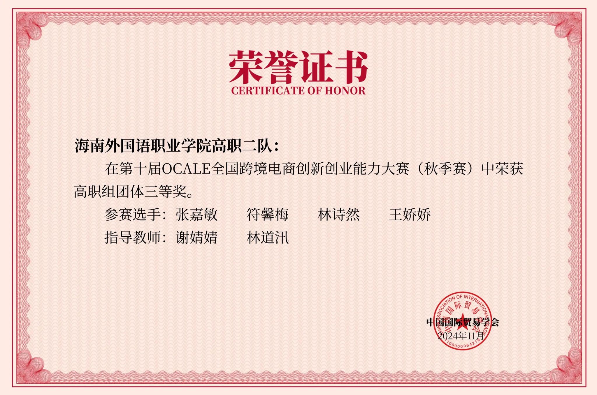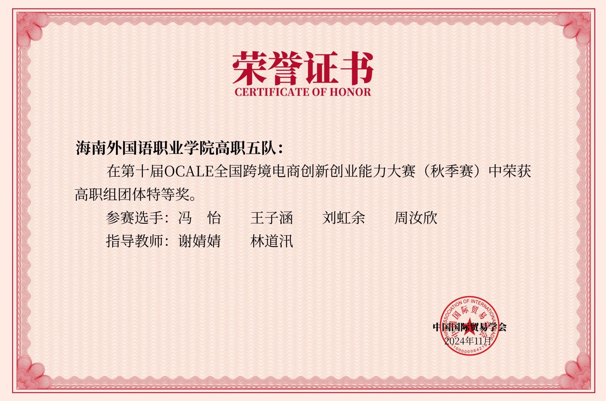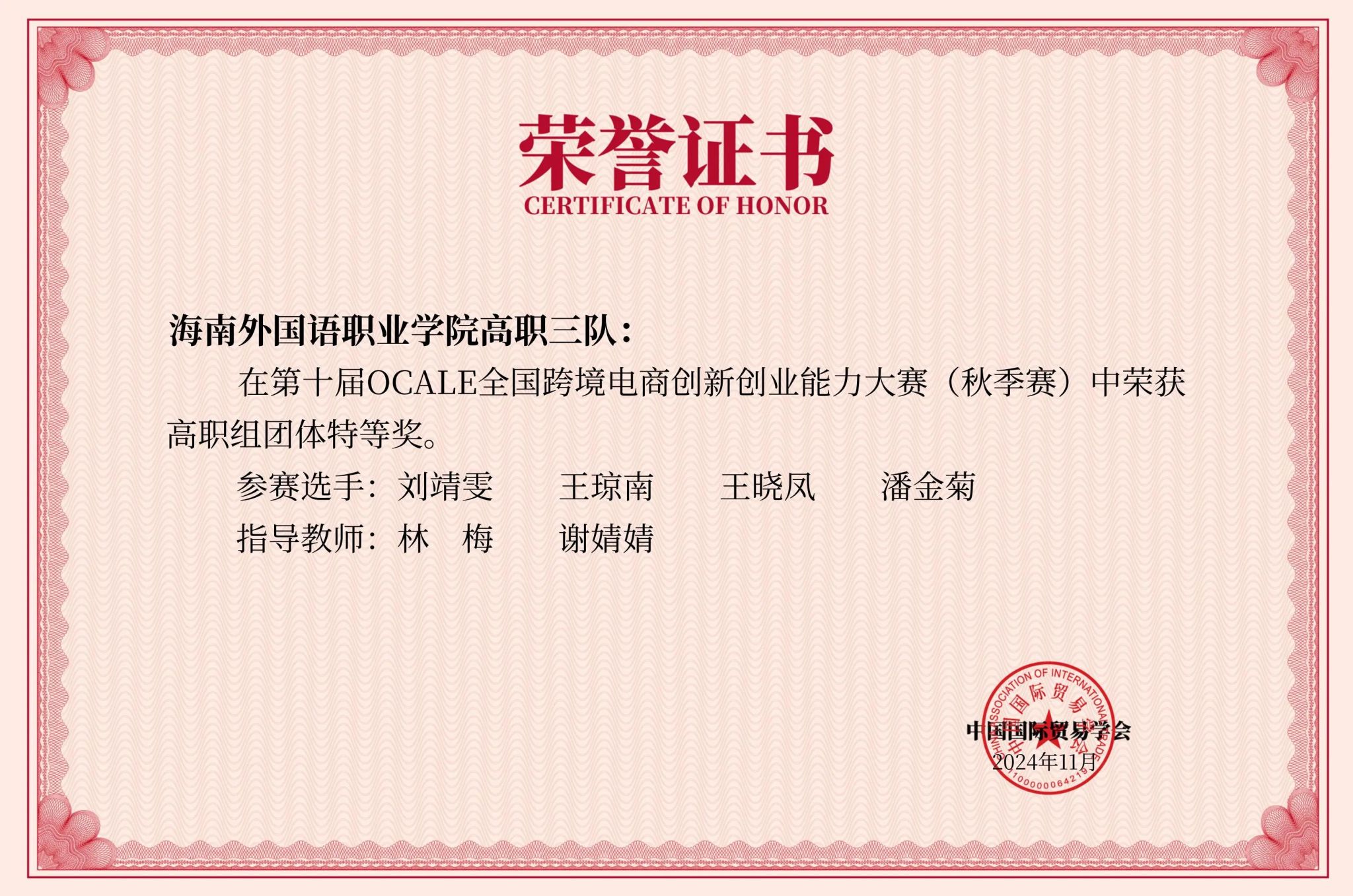 近日,由中国国际贸易学会举办的第十届OCALE全国跨境电商创新创业能力大赛(秋季赛)顺利结束。经过激烈角逐,今年会国际商务学院冯怡、刘虹余、周汝欣、王子涵同学团队,潘金菊、王晓凤、王琼南、刘靖雯同学团队以及陈嘉腾、游家好、汤凯翔、梁川同学团队3支队伍在大赛中表现优异,分别斩获全国特等奖;王娇娇、符馨梅、林诗然、张嘉敏同学团队获得全国三等奖。谢婧婧、林梅、林道汛老师分别获优秀指导老师特等奖。