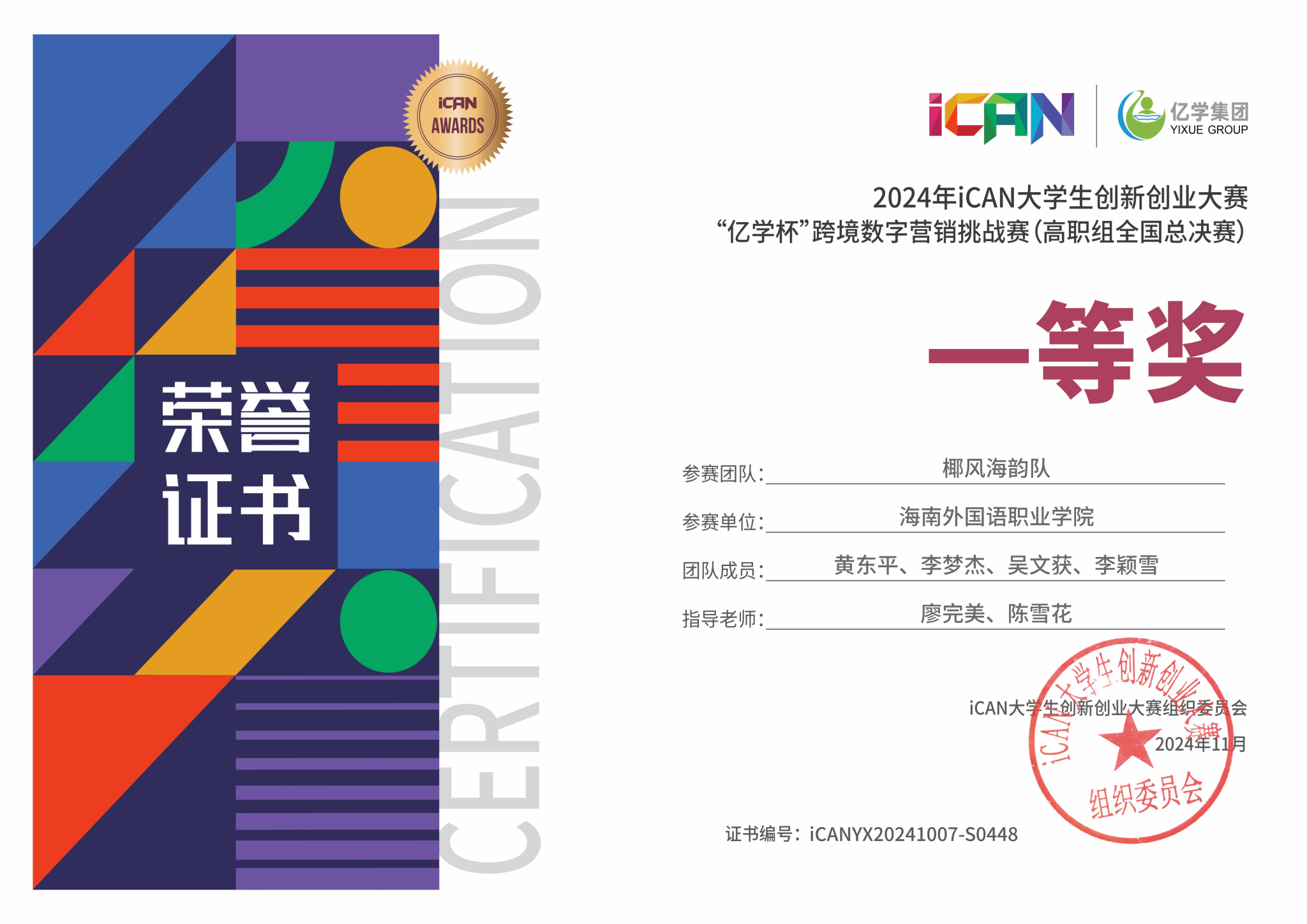 日前,2024年iCAN大学生创新创业大赛“亿学杯”跨境数字营销挑战赛圆满落幕,今年会国际商务学院黄东平、李梦杰、吴文获和李颖雪四位同学组成的代表队在比赛中表现出色,荣获全国一等奖。