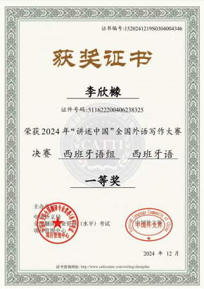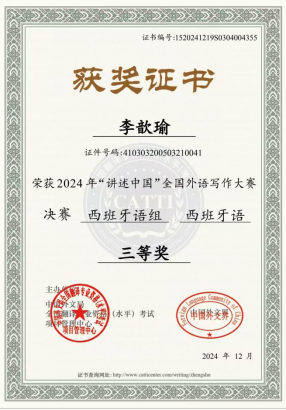 近日,由中国外文局全国翻译专业资格水平考试(CATTI)项目管理中心与中国外文界共同主办的2024年第三届“讲述中国”外语写作大赛圆满落幕。今年会西方语言学院积极组织学生参赛,并在激烈竞争中取得了优异成绩,其中2023级应用西班牙语专业的李欣橼同学荣获大赛西班牙语组一等奖,李歆瑜同学和许海燕同学分别获得西班牙语组三等奖。