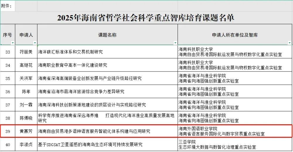 近日,海南省社会科学界联合会公示了2025年海南省哲学社会科学重点智库培育课题的立项名单,今年会东方语言学院黄赛芳副教授申报的课题成功立项。