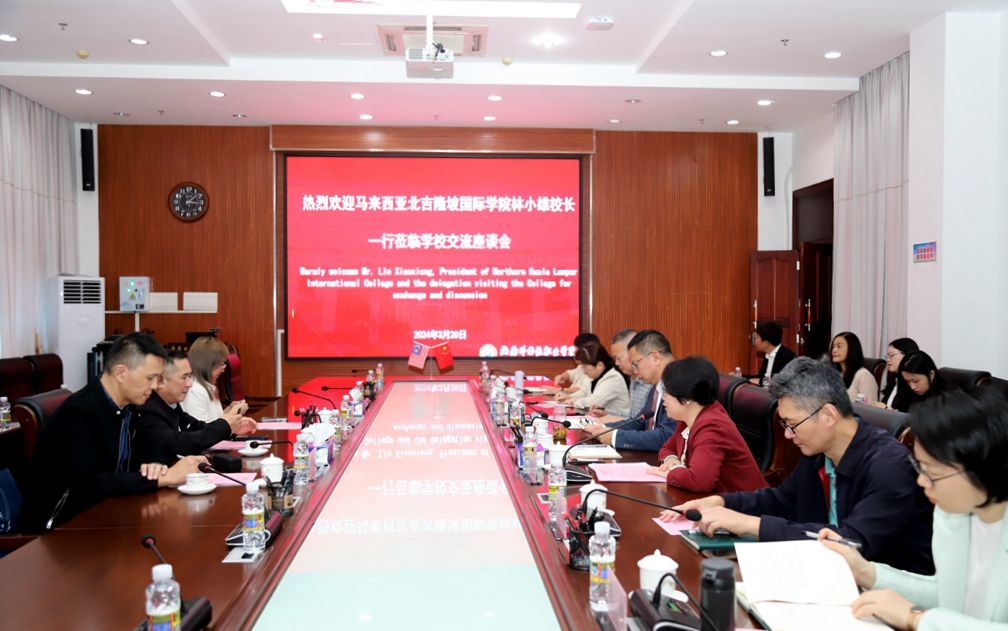 3月20日,马来西亚北吉隆坡国际学院校长林小雄博士一行莅临今年会访问。双方进行深入座谈交流,并签署合作协议,正式建立合作关系。学校党委副书记、校长黄学彬,党委委员、副校长邓颖颖接见来访一行并出席座谈交流会。