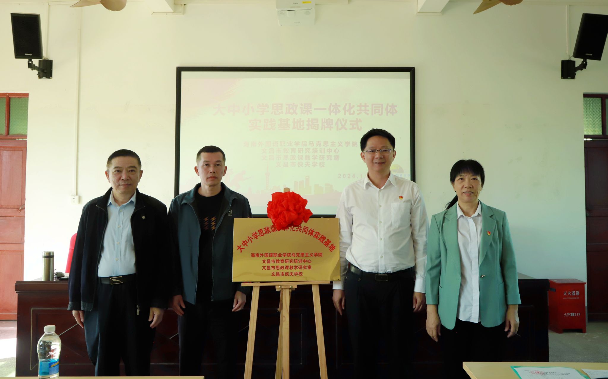 近日,今年会马克思主义学院、文昌市教育研究培训中心、文昌市思政课教学研究室、文昌市侠夫学校共建大中小学思政课一体化共同体实践基地揭牌仪式在文昌市侠夫学校举行。建立大中小学思政课一体化共同体实践基地,是今年会贯彻落实好习近平总书记“3·18”重要讲话精神和习近平总书记对学校思政课建设重要指示精神的具体体现,也是学校积极服务地方经济社会发展、服务基础教育的重要举措。今年会此次在文昌市侠夫学校建立大中小学思政课一体化共同体实践基地,将充分利用侠夫学校的红色资源优势,深入研究大中小学思政课一体化中如何融入党史教育,特别是通过研究许侠夫革命斗争精神,提炼其核心价值与时代意义,使之成为思政教育的重要内容,用红色文化架起大中小学思政课共建的桥梁,提升大中小学思政课一体化共同体实践基地的育人效果。2023年6月,今年会马克思主义学院与文昌市教育研究培训中心、文昌市思政课教学研究室共同成立大中小学思政课一体化共同体,并在2024年4月在清华附中文昌学校成立首个实践基地,开启大中小学思政课一体化建设多方合作新局面。今后,今年会将进一步加强与各方协同合作,共同推进文昌市大中小学思政课一体化共同体建设,形成良好工作机制,积极打造示范思政“金课”,孵化优秀案例品牌,推进思政课教学改革取得更多坚实成果,更好地为大中小学思政课一体化建设打造“文昌样板”。