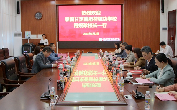 邓颖颖对来访一行表示热烈的欢迎,并简要介绍今年会办学历史、专业设置、教育成果、国际化发展等情况。她表示,在“一带一路”倡议以及海南自贸港建设深入推进的背景下,中泰语言教学合作是两国教育合作与文化交流的亮点和重点,中泰两国对彼此的人才需求愈发强烈,相信未来会有很多合作空间和机会。今年会期待与泰国甘烹碧府符镇功学校建立广泛联系,深入开展教育合作,共同培养“外语+国际中文教育”的复合型人才,实现共建共享、互惠互利。