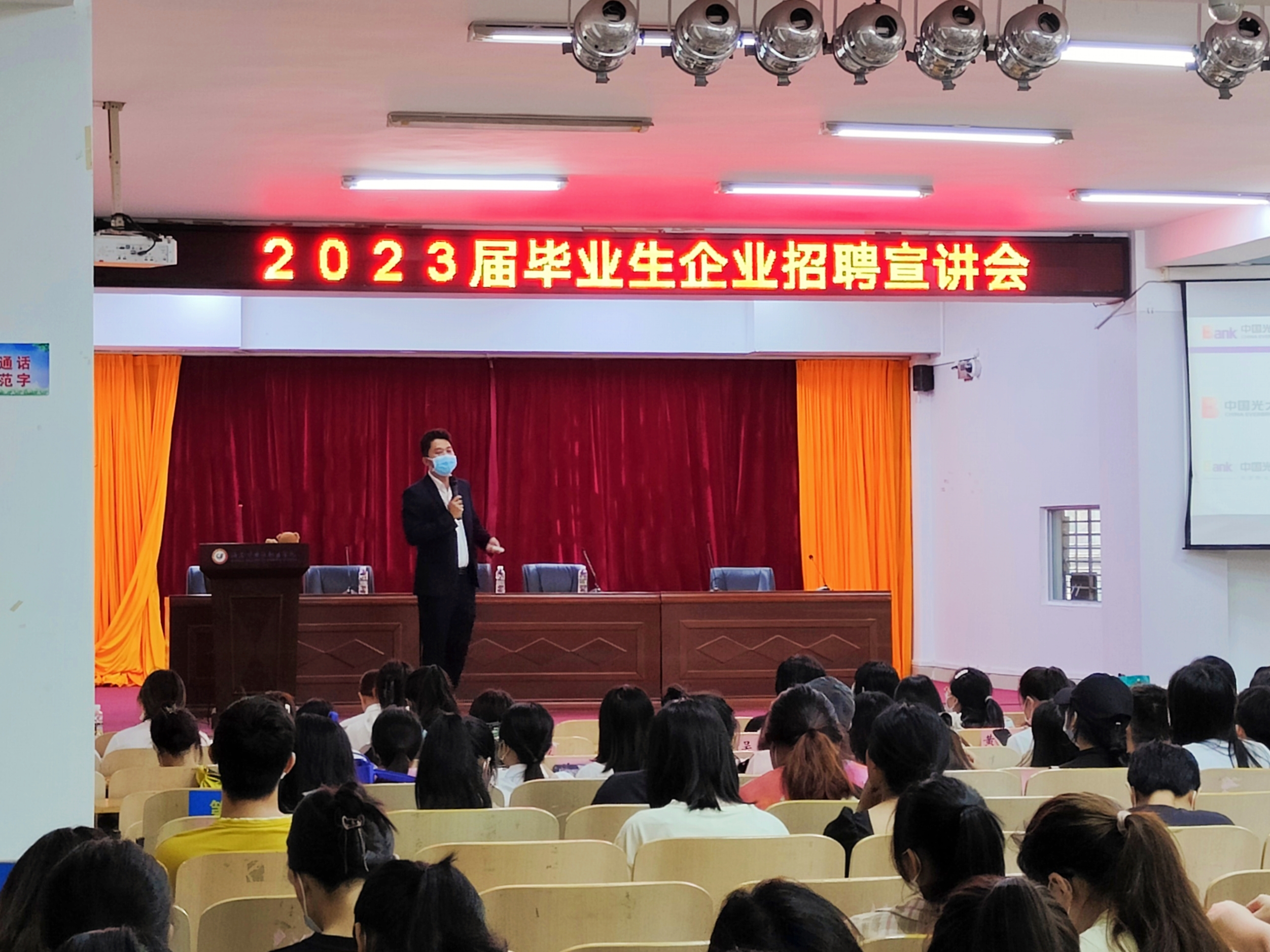 中国光大银行股份有限公司海口分行区域经理冯清润先生以“就业优先战略-深化校企交流融合——为中国特色自由贸易港建设奉献力量”为切入点,开门见山的和毕业生说明入职即就业,通过“以客户为中心,以市场为导向”的经营原则,秉承“敬业、顽强、团结、自律”的企业精神介绍工作内容、岗位职责,以及干净整洁的工作环境和丰富的员工福利。此次招聘宣讲会,中国光大银行股份有限公司海口分行招聘岗位数共计30人,初步达成招聘意向人数合计25人。