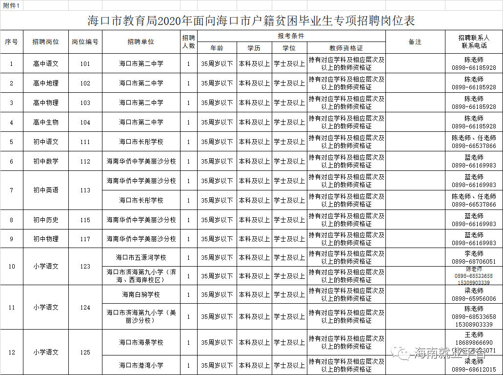 附件1.海口市教育局2020年面向海口市户籍贫困毕业生专项招聘岗位表.xls