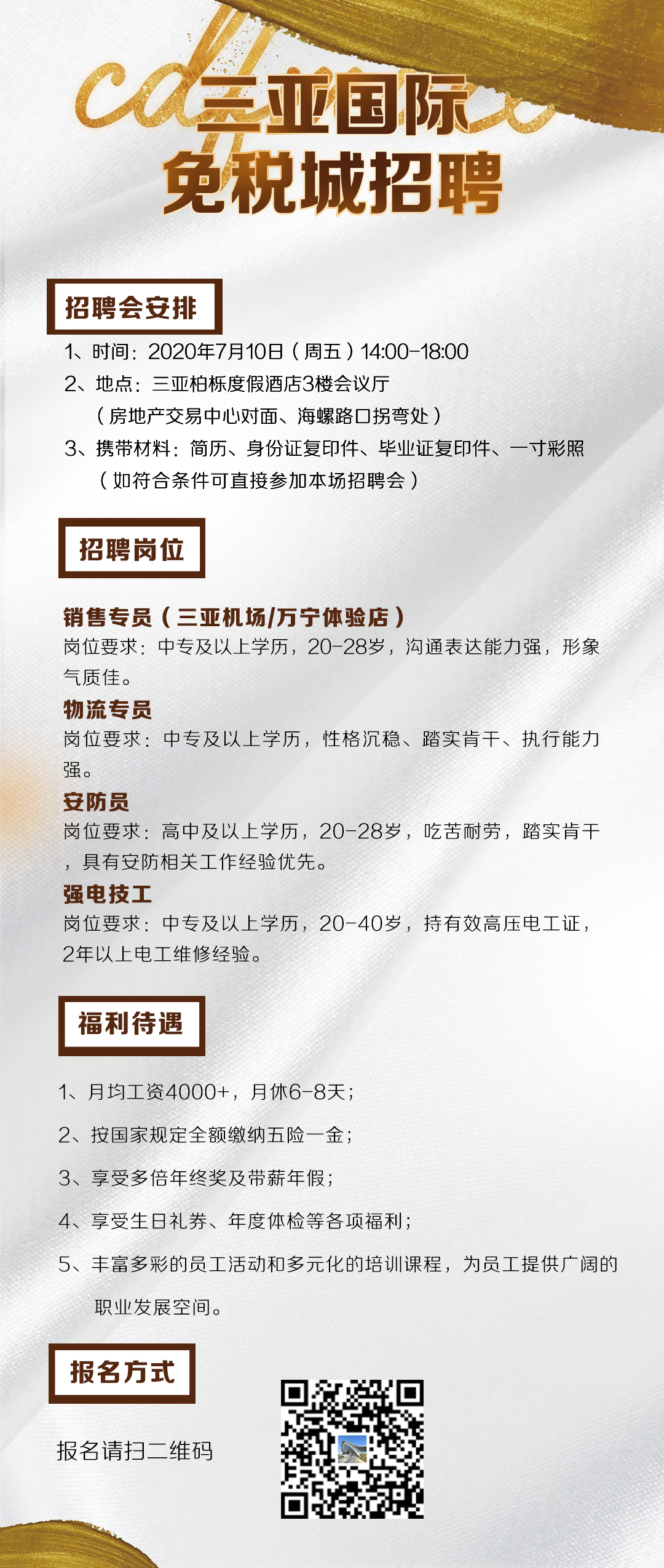招聘信息 当前位置: 首页 >> 招聘宣讲 >> 招聘信息 >> 正文 招聘信息 | 三亚国际免税城- 7月10日 三亚专场招聘会 发布日期:2020-07-09 点击: 转载自:中免集团三亚国际免税城招聘 (温馨提示:新型冠状病毒肺炎疫情期间,请往邮箱投递简历。在未被进一步通知的情况下不要擅自前往应聘单位。招聘公司地址仅以本网站为准,请同学们面试时注意核对。) 上一篇:正式教师编制,专科可报,应、往届生可报,招60人,海口市教育局2020年面向海口市户籍贫困毕业生专项招聘公告(第一号) 下一篇:招聘信息 | 海南懂得网络文化传媒有限公司