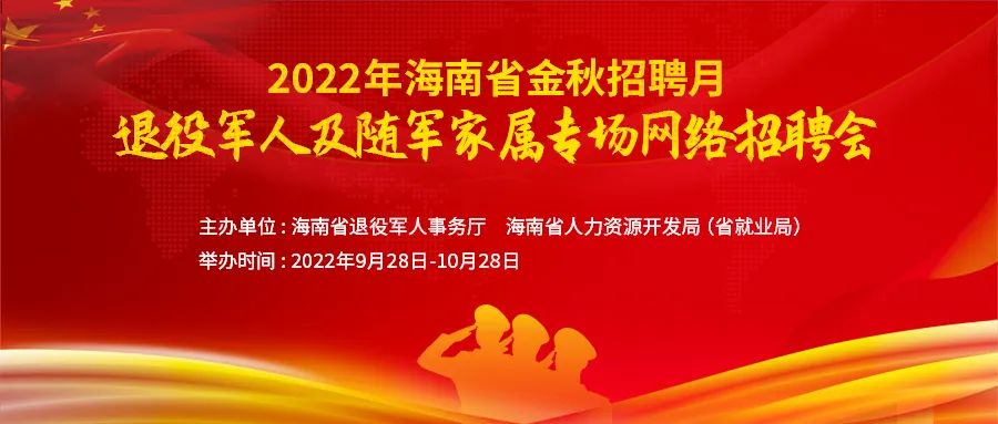 为搭建退役军人和企业“双向互通、需求互补”的就业服务平台,拓宽退役军人就业渠道,助力退役军人实现稳定就业,海南省人力资源开发局(省就业局)联合海南省退役军人事务厅举办2022年海南省金秋招聘月——退役军人及随军家属专场网络招聘会,欢迎用人单位报名参加!
