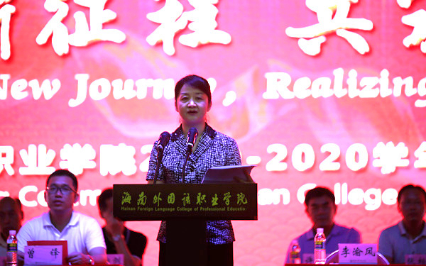 在庄严地国歌中,开学典礼拉开了帷幕。李渝凤院长在典礼上致辞,她代表全校师生对新教师和新同学,表示热烈的欢迎和诚挚的问候。她向全体师生介绍了我院过去一年在办学综合实力、人才培养、对外交流和教育教学成就等方面的显著成就,并向2019级新生提出要求:一是坚定理想信念,树立家国情怀,勇于担当责任,既要注重小我更要看重大我,为祖国繁荣昌盛做贡献;二是要勤学勤练,创新思维,筑牢扎实基础,学好专业技能,培养自身的综合素养和人文素养,做到学有所用,才有所施;三是要培养国际视野和跨文化交际能力,增强多元文化意识,为学院发展、国家“一带一路”和海南自贸区自贸港的建设贡献自己的青春力量。