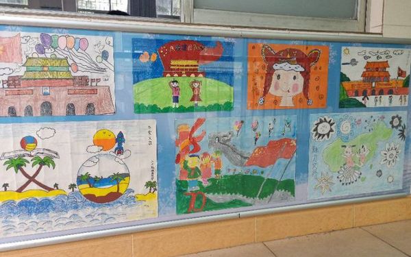 这是美术课上同学们的作品,在走到教学楼内,会发现学生的各种优秀作品在教学楼梯墙壁上随处可见,每一处都有精彩内容。