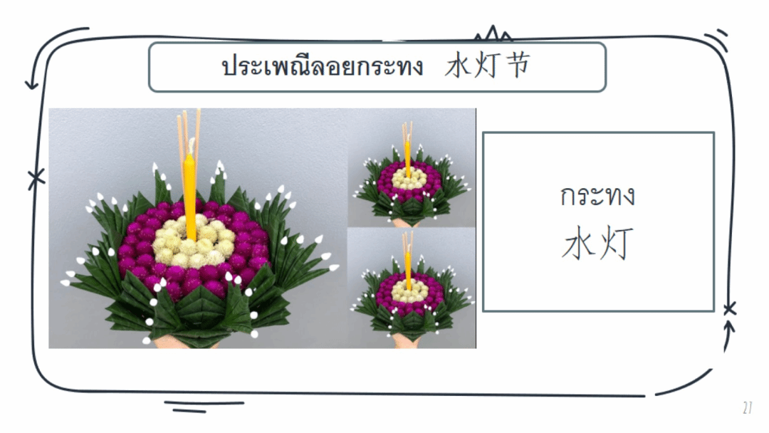 提及水灯节潘知恩老师告诉同学们,泰国水灯节的水灯制作过程,宛如一场充满艺术与虔诚的仪式。制作水灯,首先要精心挑选合适的材料。芭蕉叶是制作水灯的主要材料之一,人们会去芭蕉林中,挑选色泽鲜绿、叶片完整且富有韧性的芭蕉叶。选好的芭蕉叶要经过仔细的清洗,去除表面的灰尘和杂质,然后晾干备用。除了芭蕉叶,还需要准备竹篾、鲜花、蜡烛、香等物品。竹篾要选质地坚硬、粗细均匀的,用来搭建水灯的框架。