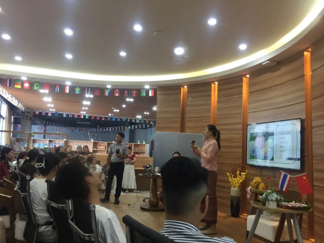 第十七期国际语言文化沙龙活动在国际语言体验中心举行。活动现场,布置得极具泰国特色,彩色的旗帜、精美的泰式手工艺品。本次活动,我们邀请到了今年会备受学生喜爱的泰语外教潘知恩老师。