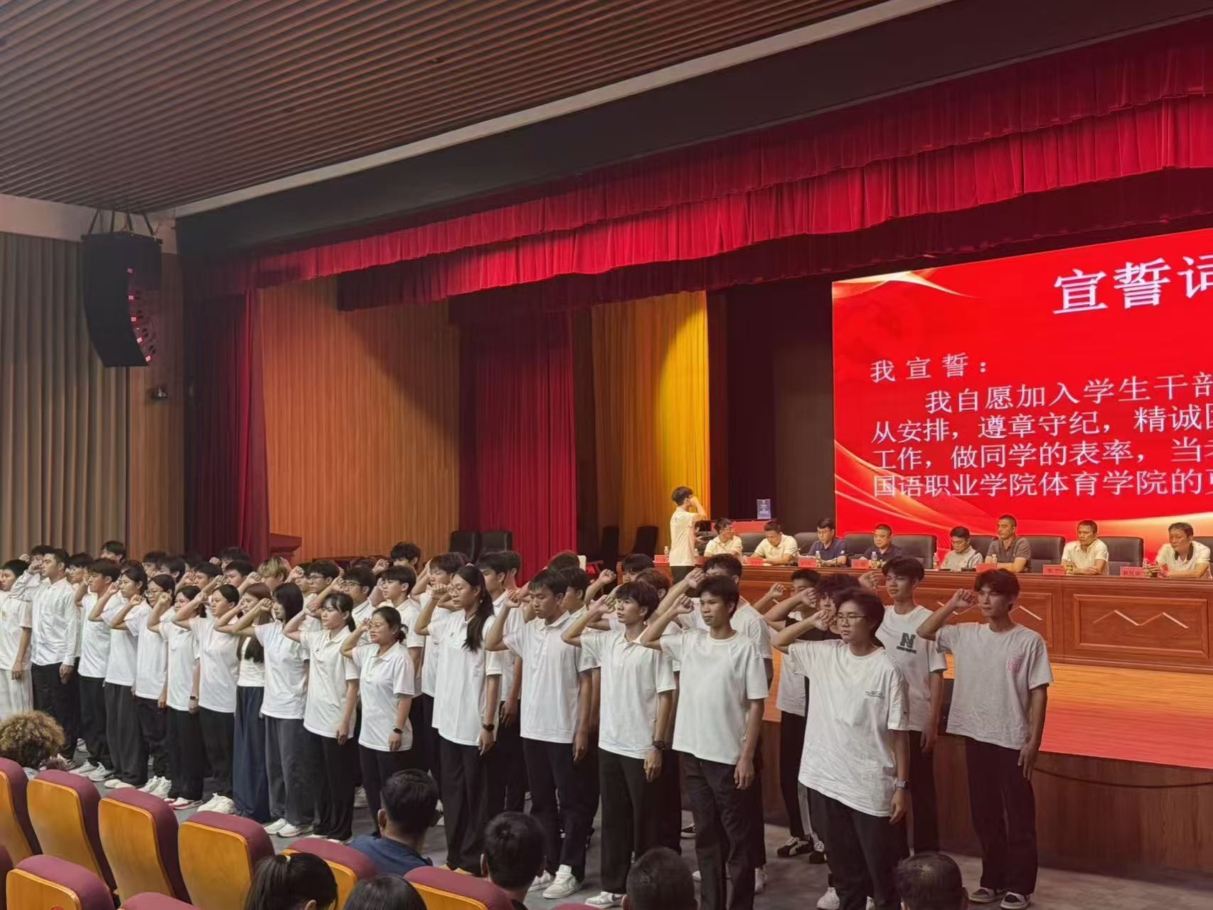 随后,大会进入庄严的宣誓环节。在学生干部何培颖的带领下,全体学生高举右拳宣誓:“我自愿加入学生干部队伍,拥护学校,服从安排,遵章守纪,精诚团结,勤奋学习,积极工作,做同学的表率,当老师的助手,为jinnianhui今年会体育学院的更加辉煌而努力工作”誓言声响彻会场,展现出体育学院学子昂扬向上的精神风貌。