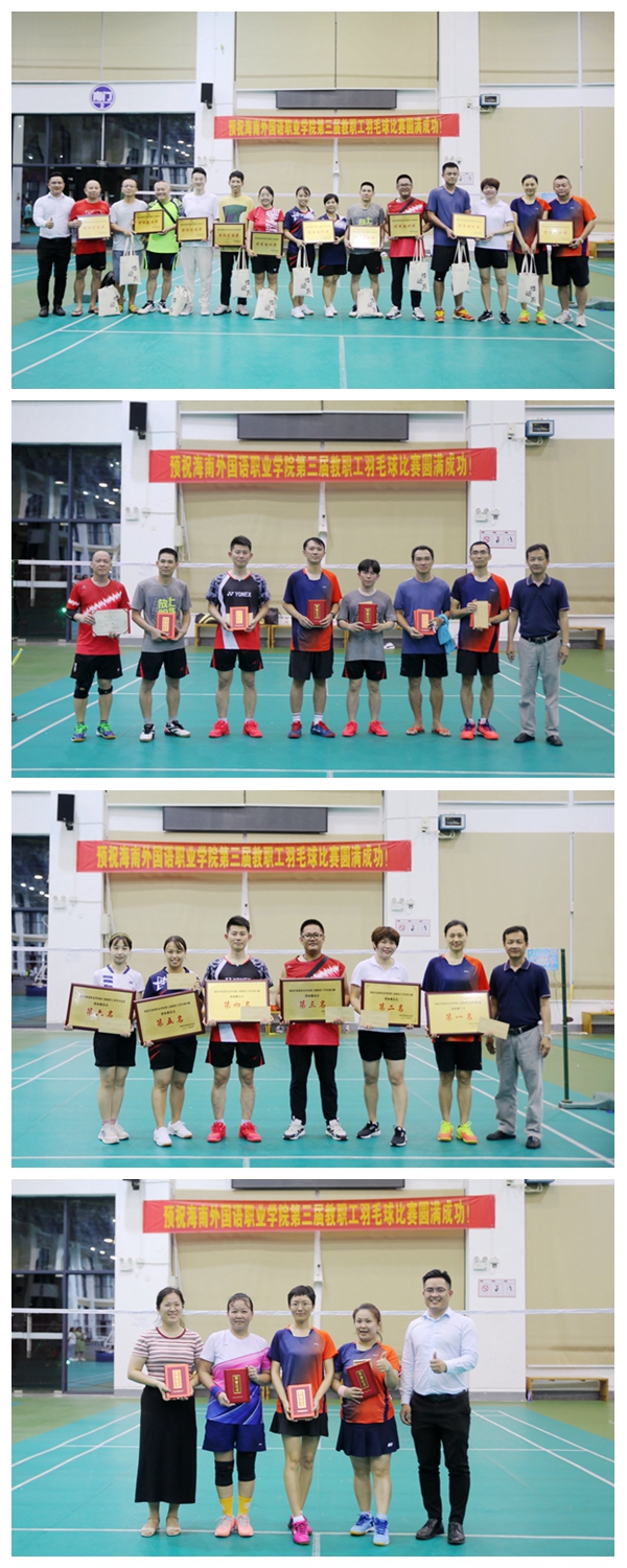 为活跃校园文化氛围,丰富教职工业余文化生活,充分展现我院教职工风采,增进教职工交流与沟通,增强集体凝聚力,构建健康、快乐、和谐校园,5月8日至13日,由学院工会组织在体艺馆内举办第三届教职工羽毛球比赛正式开赛,来自学院机关各部门、各系部共10支参赛队参加了团体的比赛,26名教职工参加了单项的比赛。13日下午,比赛在体艺馆落下帷幕,经过4天的激烈角逐,国际商务系代表队摘获团体比赛第一名,公共教学部代表队、机关一代表队分获二、三名。