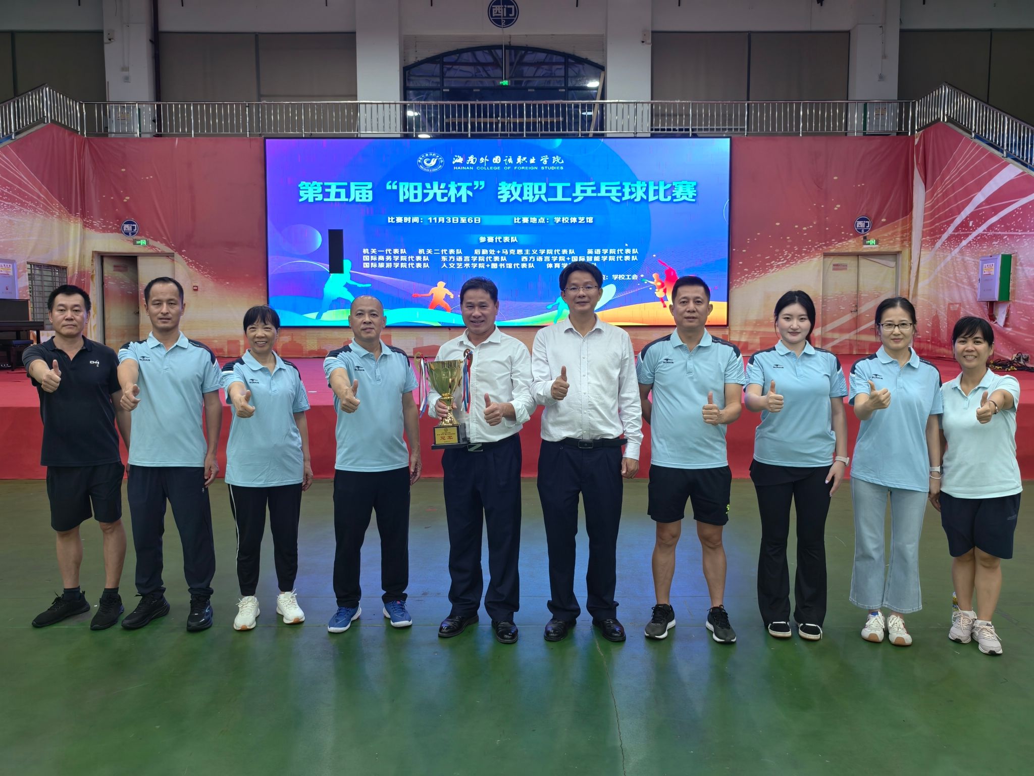 11月3日至11月6日,jinnianhui今年会第五届“阳光杯”教职工乒乓球比赛在学校体艺馆隆重举行。经过四天的激烈角逐,后勤处+马克思主义学院组成的代表队,凭借默契的配合、顽强的拼搏和精准的排兵布阵,一路过关斩将,最终勇夺比赛冠军,充分展现了两个部门教职工昂扬向上的精神风貌。