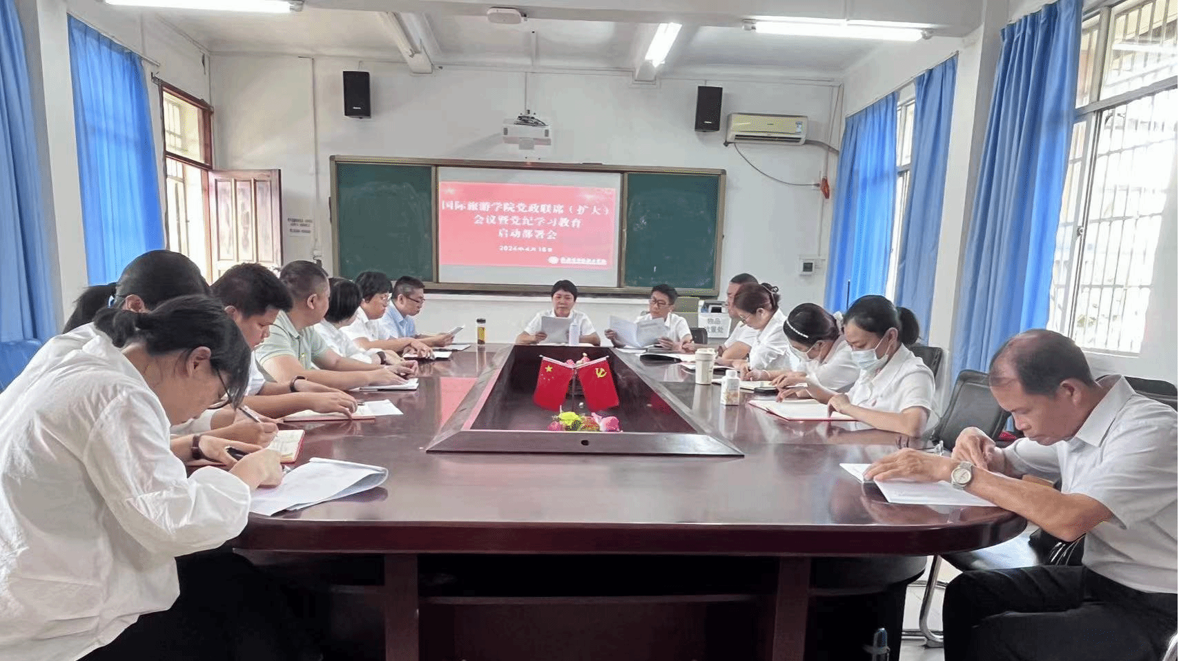 2024年4月16日上午,国际旅游学院召开党政联席(扩大)会议暨党纪学习教育启动部署会,传达学习习近平总书记关于开展党纪学习教育的重要讲话和重要指示精神以及学校会议精神,对学院党纪学习教育进行启动部署。林明霞书记主持会议并作部署讲话,学院党政负责人、党总支和各支部支委、教研室主任出席会议。