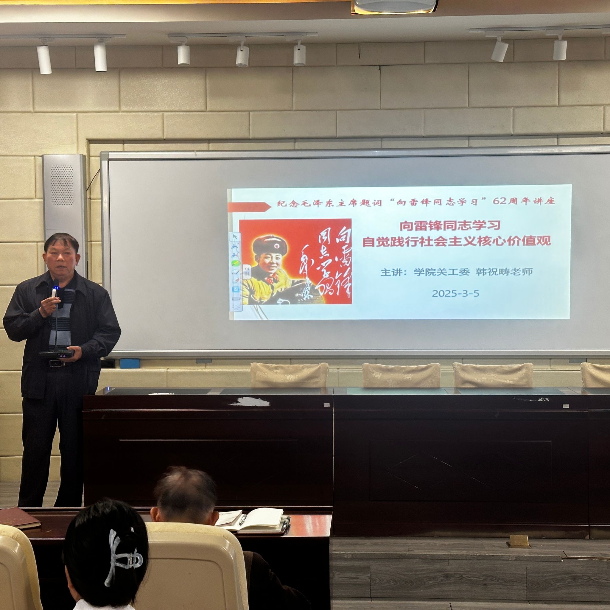 为进一步弘扬和传承雷锋精神,鼓励和引导高校青年学生积极践行学雷锋志愿服务活动,3月21日上午,学校关工委主任韩祝畴老师向国际旅游学院全体入党申请人、入党积极分子及党员同志作纪念毛泽东同志题词“向雷锋同志学习”62周年讲座暨主题党日活动。