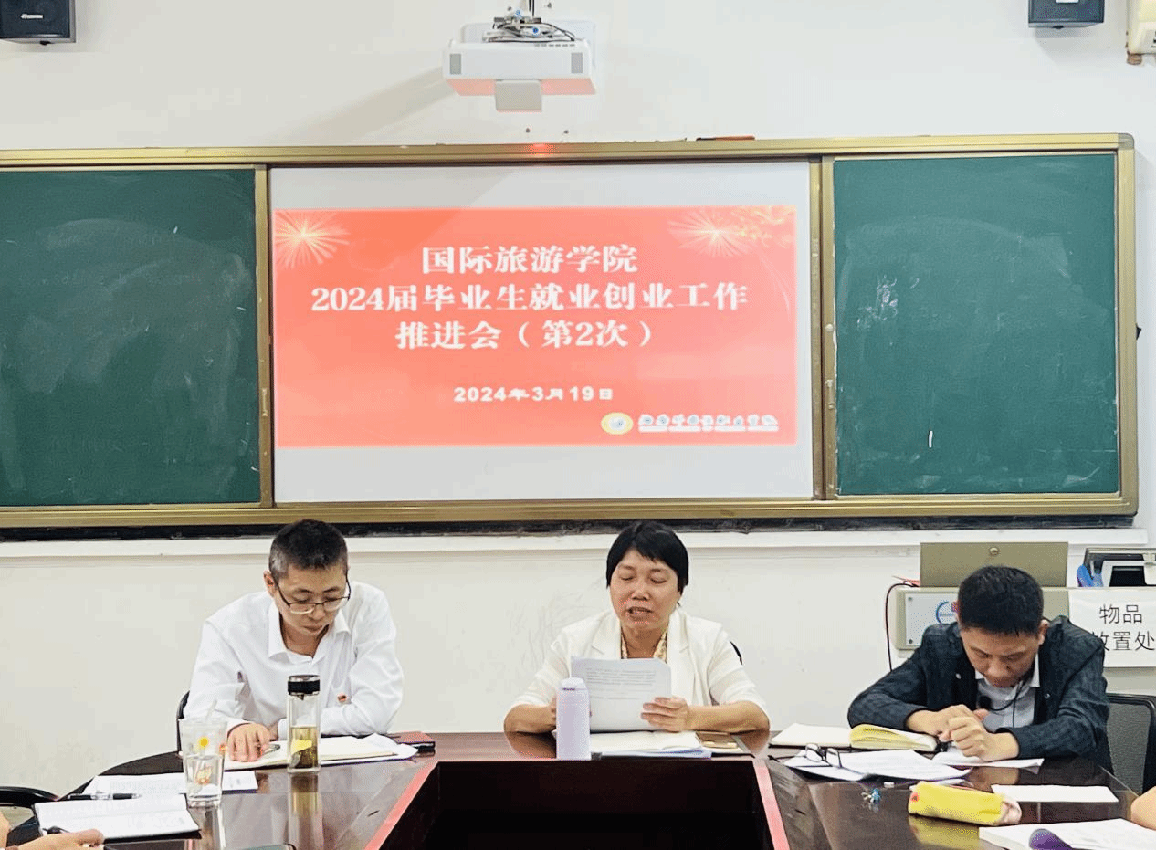 2024年3月19日下午,国际旅游学院在1号教学楼1204会议室召开了2024届毕业生就业创业工作推进会(第2次)。我院党总支书记、就业创业工作领导小组组长林明霞、副院长谢孟、党总支副书记周群林、就业指导专员潘明慧以及2024届毕业生实习就业指导老师和全体辅导员出席了此次会议。