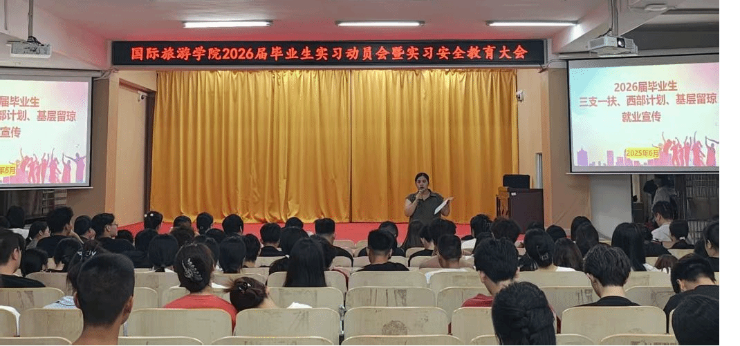 为切实做好2026届毕业生岗位实习工作,强化安全意识,明确实习要求,保障实习安全与质量,国际旅游学院于2025年6月25日在图书馆多功能报告厅召开2026届毕业生7月份实习动员暨实习安全教育大会。学院党政负责人、教研室主任、实习指导老师及全体2026届即将参加7月岗位实习的学生共同参加了本次会议。会议由实习就业指导员潘明慧老师主持。
