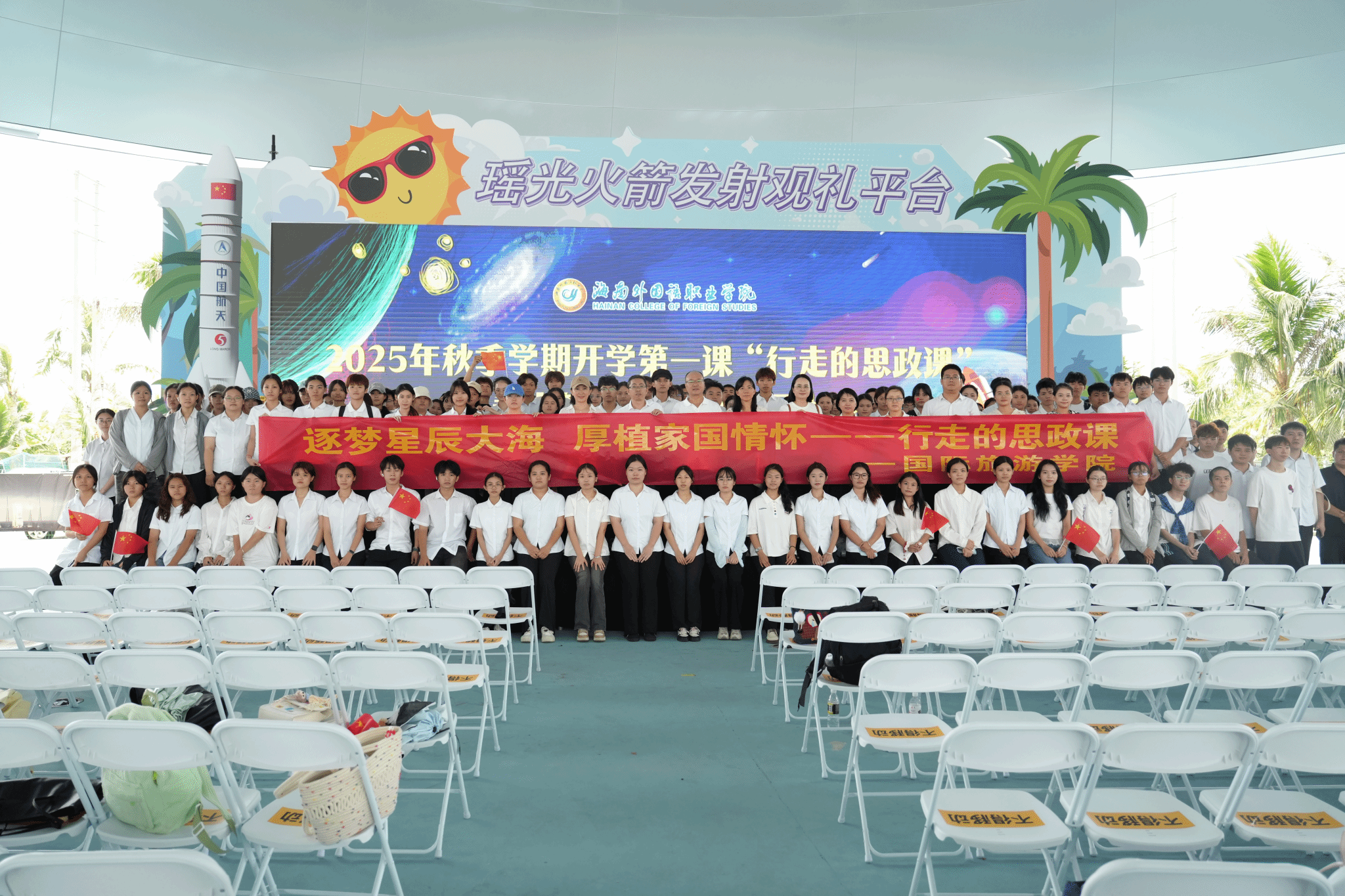 9月9日,在中国文昌航天发射场瑶光观礼台,一场别开生面的“开学思政第一课”在此精彩上演。国际旅游学院370名师生齐聚一堂,共同见证长征七号改运载运载火箭发射的震撼瞬间,开启了一场融合专业、文化与家国情怀的独特思政之旅。